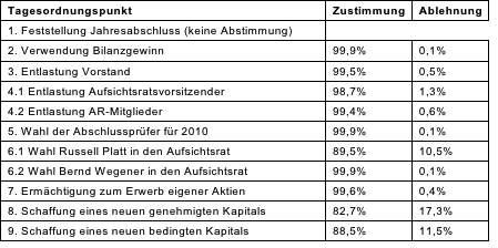 Die Hauptversammlung hat bei einer Präsenz des Grundkapitals von 73 Prozent sämtlichen Tagesordnungspunkten der Verwaltung mit großer Mehrheit zugestimmt (die einzelnen Abstimmungsergebnisse finden sich in der Tabelle). Im Zentrum der Beschlüsse standen neben der Ausschüttung einer Dividende in Höhe von 0,30 Euro je Aktie die Schaffung eines genehmigten Kapitals in Höhe von 19,5 Mio. Euro.