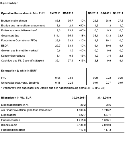 Der FFO (Funds From Operations: operatives Ergebnis vor Abschreibungen und Steuern, sowie vor Gewinnen aus Verkäufen und Entwicklungsprojekten) des ersten Halbjahres 2011 betrug 29,8 Mio. EUR und lag damit erwartungsgemäß unterhalb des Vorjahresergebnisses (Q1 – Q3 2010: 33,1 Mio. EUR). Der Rückgang basiert vor allem auf dem verkleinerten Portfolio mit geringeren Mieteinnahmen. Je Aktie belief sich der FFO auf 0,68 EUR (Q1 – Q3 2010: 0,88 EUR).