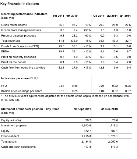 At EUR 29.8 million, the FFO (funds from operations, defined as earnings before depreciation, interest and taxes, and excluding profits from disposals and development projects) for the first nine months of 2011 was down on the previous year (9m 2010: EUR 33.1 million). The decline is based above all on the reduced portfolio with the corresponding lower rental income. The FFO per share amounted to EUR 0.68 (9m 2010: EUR 0.88).